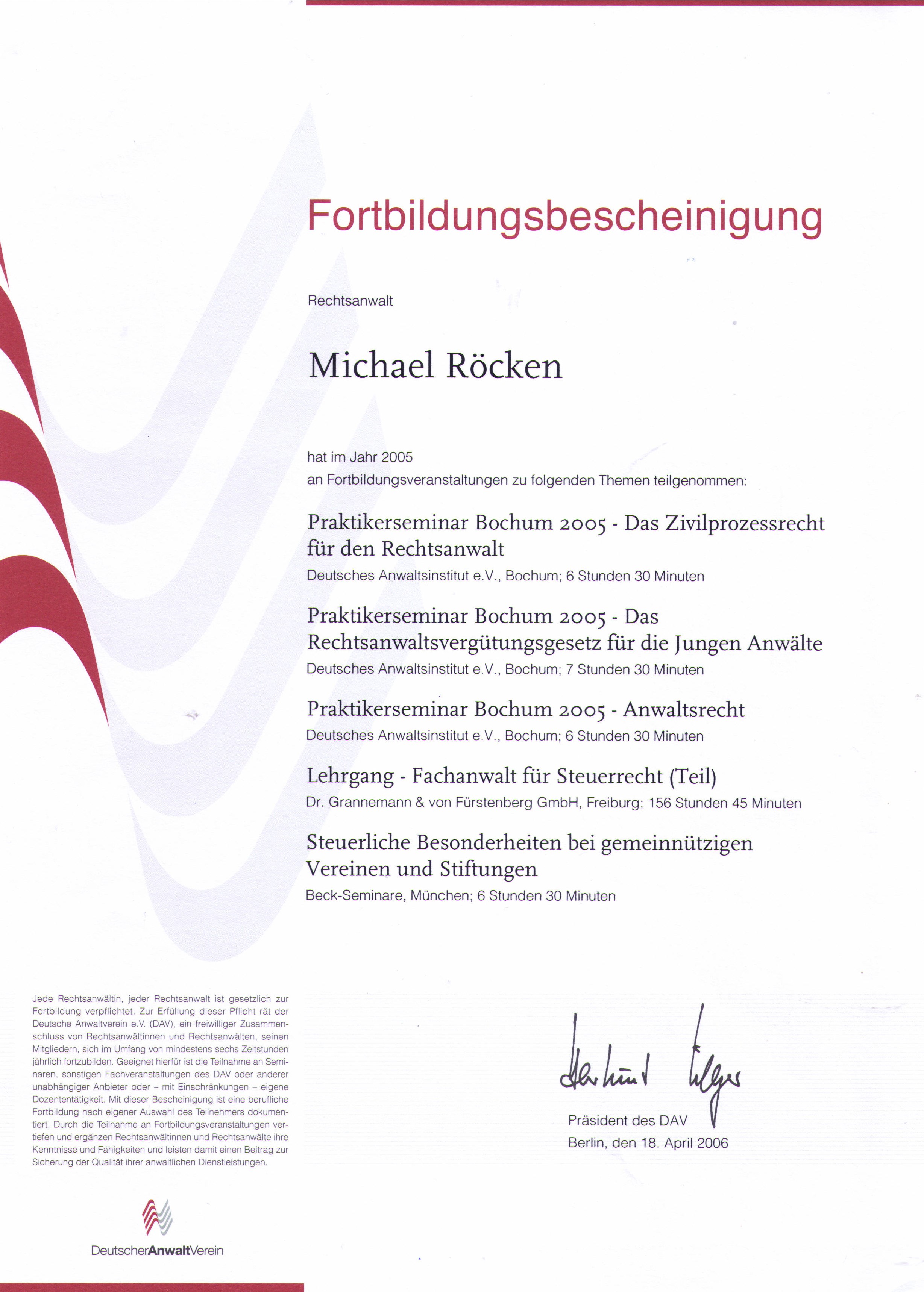 Sowohl der Deutsche Anwaltsverein (DAV) als auch die Bundesrechtsanwaltskammer stellen jährlich entsprechende Fortbildungsbescheinigungen aus.