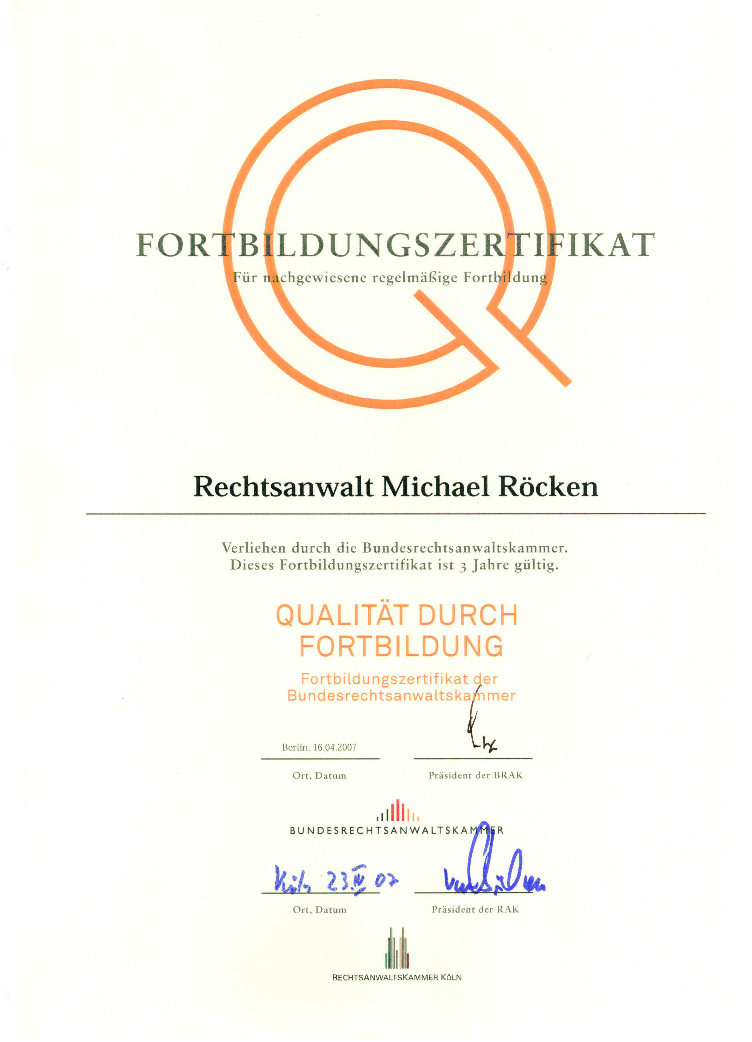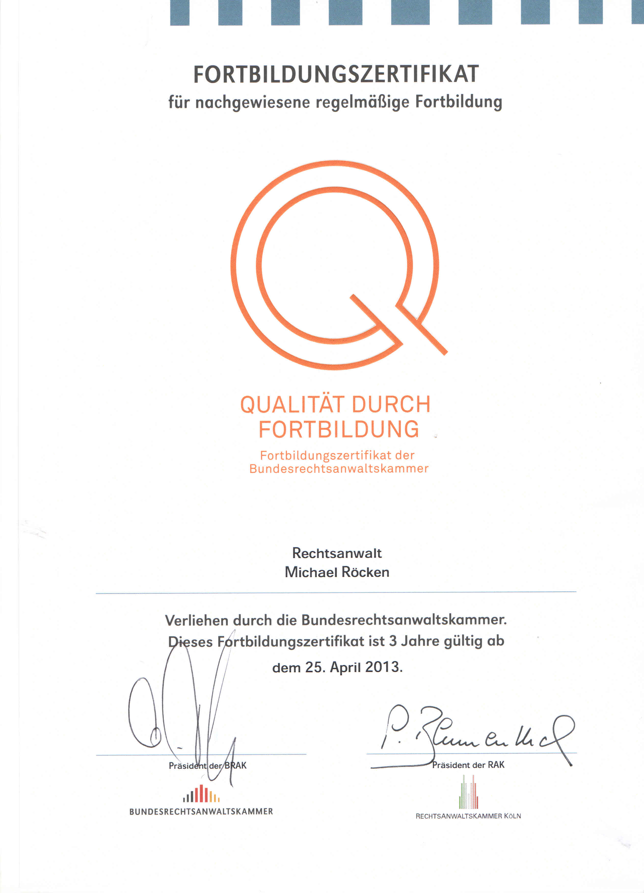 Die Bundesrechtsanwaltskammer hat ein einheitliches Fortbildungszertifikat für die Rechtsanwälte geschaffen. Dieses darf geführt werden, wenn der Rechtsanwalt sich in verschiedenen Bereichen fortbildet. Die Fortbildung kann durch die Teilnahme an Semniaren (sowohl als Teilnehmer als auch als Dozent) oder durch Veröffentlichungen erfolgen. Sie muss sich auf die folgenden Bereichen erstrecken:
